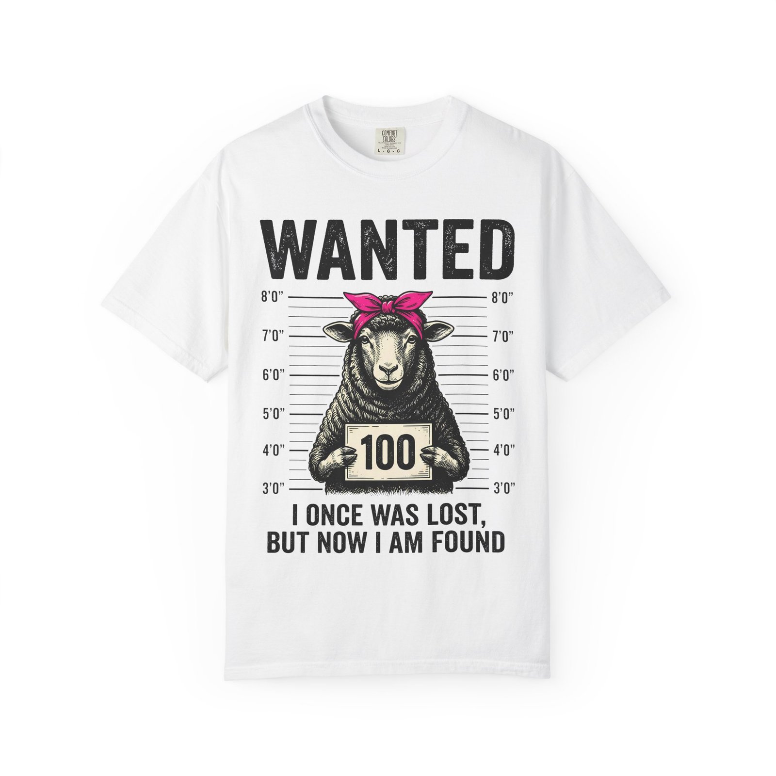 Wanted Sheep T-Shirt — “I Once Was Lost But Now I Am Found” Mugshot Graphic